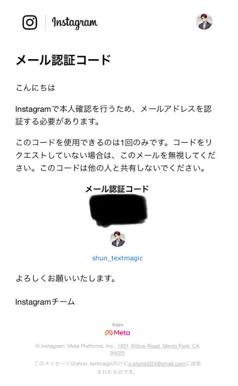 打ち込んだメールにインスタから6桁のコードが来たことを確認し、インスタの画面で入力を行う。