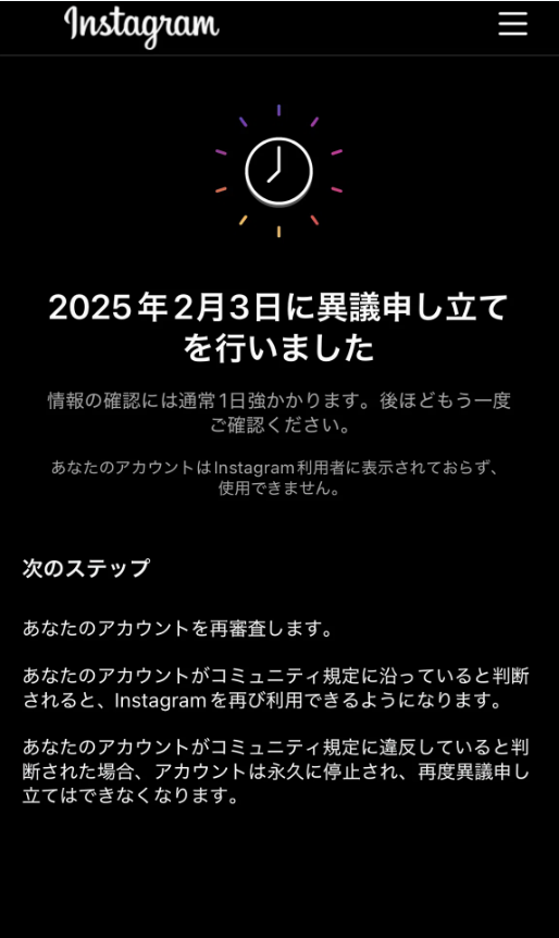 異議申し立てで解除されない場合は、Instagramの ヘルプセンター から問い合わせてみましょう。